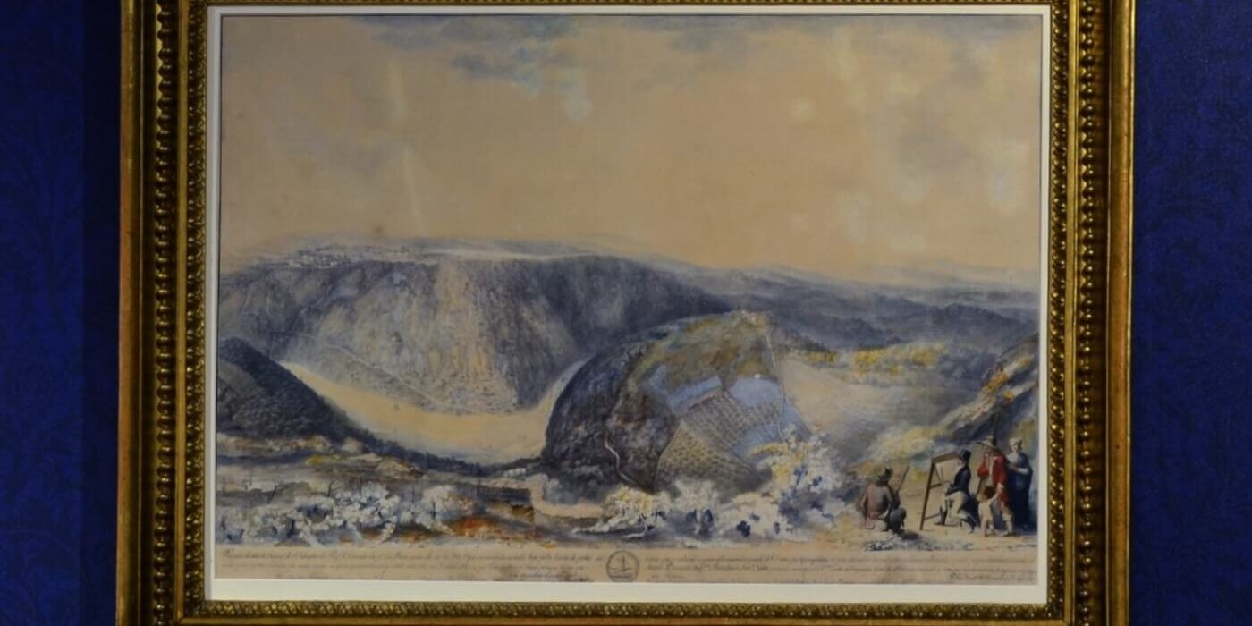 Ao longo do rio Douro, vários obstáculos dificultavam a sua navegação. A demolição desses mesmos obstáculos permitiu a navegabilidade do rio Douro até à fronteira com Espanha, fortalecendo assim a produção do Vinho do Porto, no Douro Superior. A destruição do Cachão da Valeira foi uma das diversas obras empreendidas pela Companhia, tendo decorrido entre 1780 e 1792. A aguarela em questão, encontra-se no quarto núcleo expositivo patente do nosso Museu, no qual são apresentadas as diversas obras públicas levadas a cabo pela Real Companhia Velha.